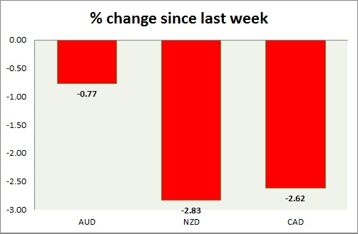 Strength meter (since last week) - Aussie -0.77%, Kiwi -2.83%, Loonie -2.62%.