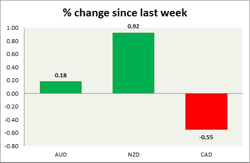 Strength meter (since last week) - Aussie +0.18%, Kiwi +0.92%, Loonie -0.55%.