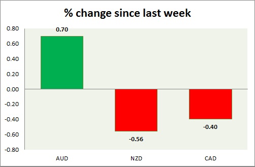 Strength meter (since last week) - Aussie +0.70%, Kiwi -0.56%, Loonie -0.40%.