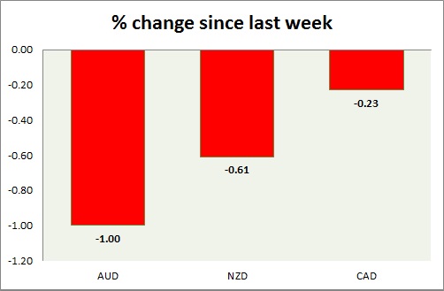 Strength meter (since last week) – Aussie -1.00%, Kiwi -0.61%, Loonie -0.23%