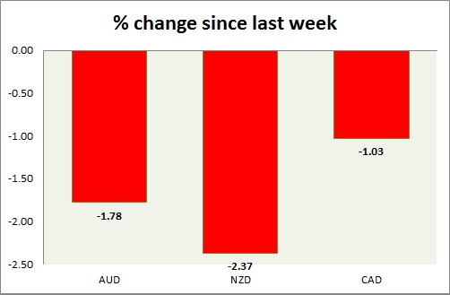 Strength meter (since last week) - Aussie -1.78%, Kiwi -2.37%, Loonie -1.03%.
