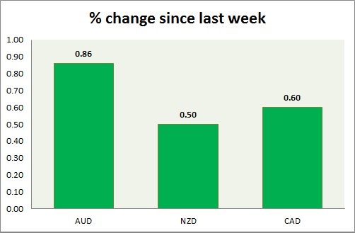 Strength meter (since last week) – Aussie +0.86%, Kiwi +0.50%, Loonie +0.60%