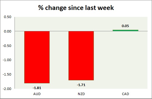 Strength meter (since last week) - Aussie -0.63%, Kiwi +1.46%, Loonie +0.02%.