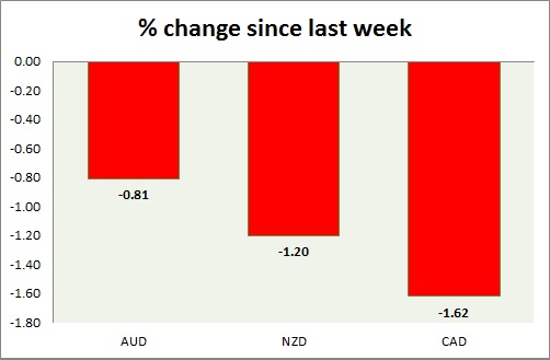 Strength meter (since last week) – Aussie -0.81%, Kiwi -1.20%, Loonie -1.62%