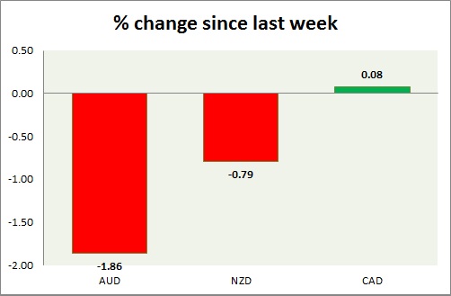 Strength meter (since last week) - Aussie -1.86%, Kiwi -0.79%, Loonie +0.08%.