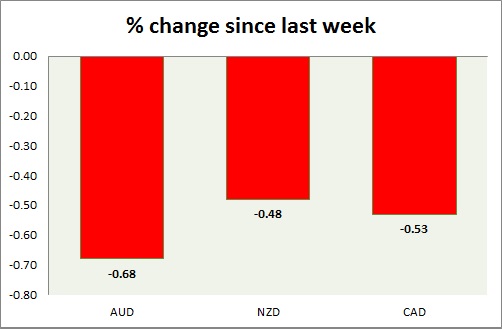 Strength meter (since last week) – Aussie -0.68%, Kiwi -0.48%, Loonie -0.53%