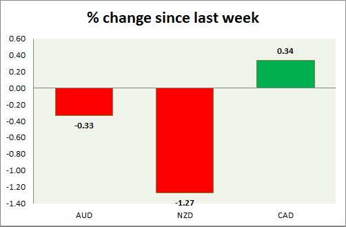 Strength meter (since last week) – Aussie -0.33%, Kiwi -1.27%, Loonie +0.34%