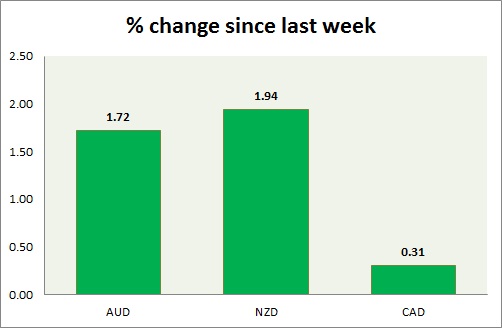 Strength meter (since last week) - Aussie +1.72%, Kiwi +1.94%, Loonie +0.31%.