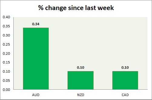Strength meter (since last week) – Aussie +0.34%, Kiwi +0.10%, Loonie +0.10%