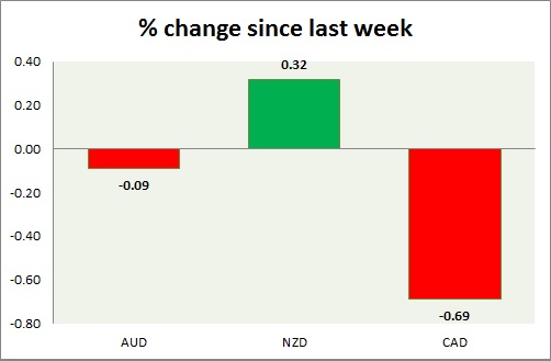 Strength meter (since last week) – Aussie -0.09%, Kiwi +0.32%, Loonie -0.69%