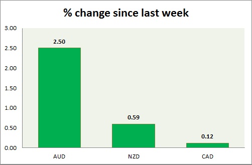 Strength meter (since last week) - Aussie +2.50%, Kiwi +0.59%, Loonie +0.12%.