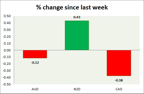 Strength meter (since last week) – Aussie -0.12%, Kiwi +0.43%, Loonie -0.38%