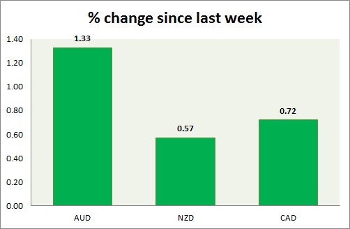 Strength meter (since last week) - Aussie +1.33%, Kiwi +0.57%, Loonie +0.72%.