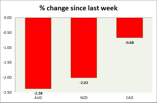 Strength meter (since last week) - Aussie -2.38%, Kiwi -2.02%, Loonie -0.68%.