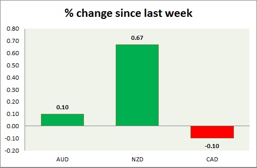 Strength meter (since last week) – Aussie +0.41%, Kiwi +0.83%, Loonie +0.07%
