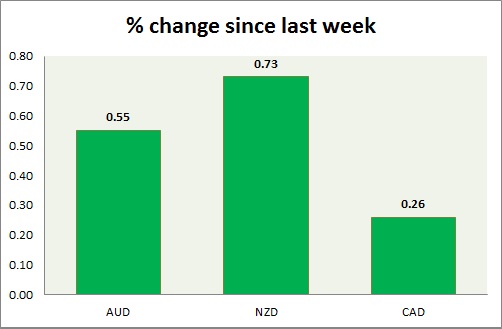 Strength meter (since last week) – Aussie +0.55%, Kiwi +0.73%, Loonie +0.26%
