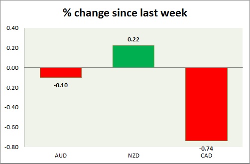 Strength meter (since last week) – Aussie -0.10%, Kiwi +0.22%, Loonie -0.74%