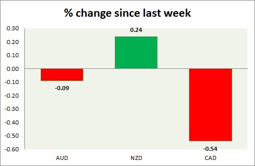 Strength meter (since last week) - Aussie -0.09%, Kiwi +0.24%, Loonie -0.54%.