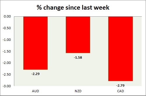 Strength meter (since last week) – Aussie -2.29%, Kiwi +0.39%, Loonie -2.82%