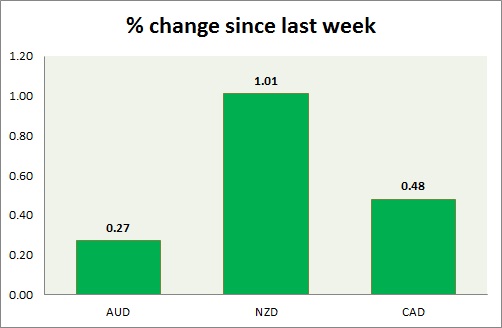 Strength meter (since last week) - Aussie +0.27%, Kiwi +1.01%, Loonie +0.48%.