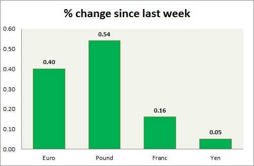 Strength meter (since last week) – Euro +0.40%, Franc +0.16%, Yen +0.05%, GBP +0.54%
