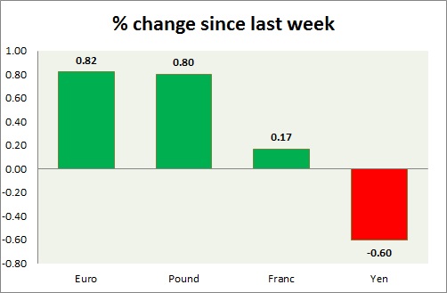 Strength meter (since last week) – Euro +0.82%, Franc +0.17%, Yen -0.60%, GBP +0.80%