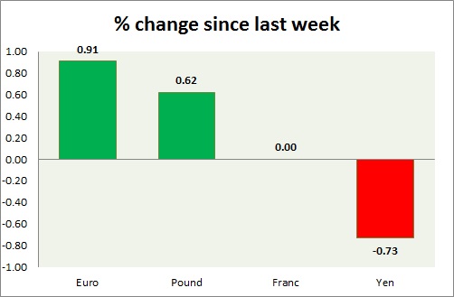 Strength meter (since last week) – Euro +0.91%, Franc +0.00%, Yen -0.73%, GBP +0.62%