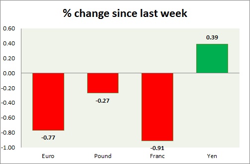 Strength meter (since last week) – Euro -0.77%, Franc -0.91%, Yen +0.39%, GBP -0.27%