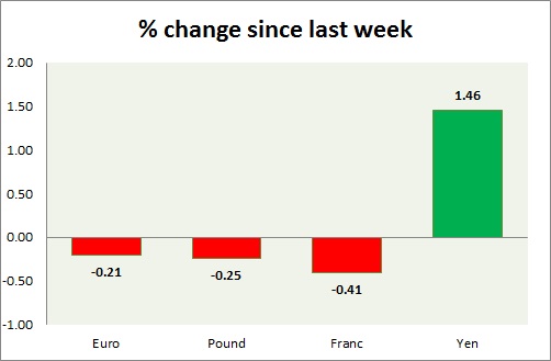Strength meter (since last week) – Euro -0.77%, Franc -0.91%, Yen +0.39%, GBP -0.27%