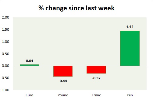 Strength meter (since last week) – Euro +0.04%, Franc -0.32%, Yen +1.44%, GBP -0.44%