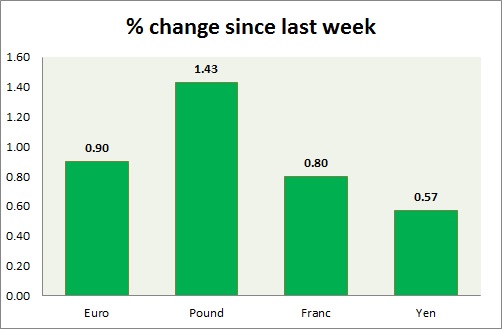 Strength meter (since last week) – Euro +0.90%, Franc +0.80%, Yen +0.57%, GBP +1.43%