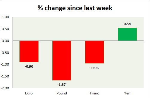 Strength meter (since last week) – Euro -0.09%, Franc -0.29%, Yen +0.24%, GBP -0.43%