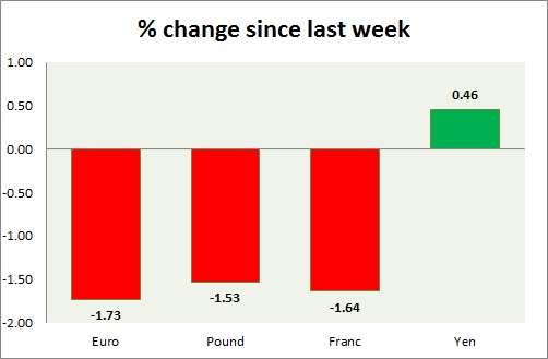 Strength meter (since last week) – Euro -0.84%, Franc -1.10%, Yen +0.87%, GBP -1.56%
