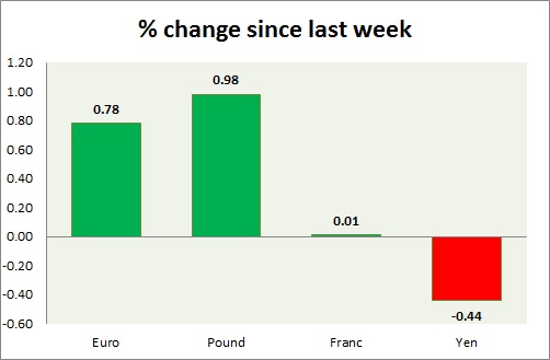 Strength meter (since last week) – Euro +0.78%, Franc +0.01%, Yen -0.44%, GBP +0.98%