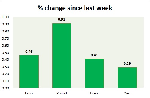 Strength meter (since last week) – Euro +0.46%, Franc +0.41%, Yen +0.29%, GBP +0.91%