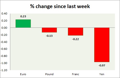 Strength meter (since last week) – Euro +0.23%, Franc -0.22%, Yen -0.97%, GBP -0.13%