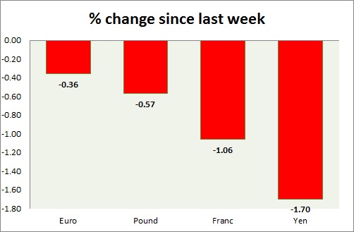 Strength meter (since last week) – Euro -0.36%, Franc -1.06%, Yen -1.70%, GBP -0.57%