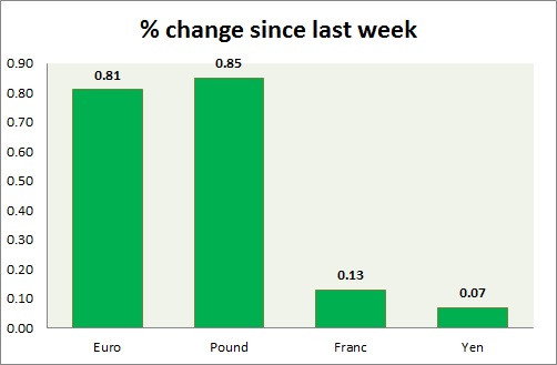 Strength meter (since last week) – Euro +0.81%, Franc +0.13%, Yen +0.07%, GBP +0.85%