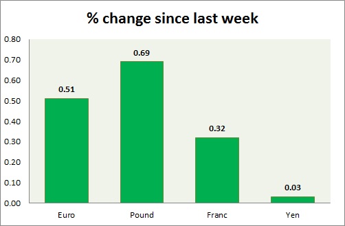 Strength meter (since last week) – Euro +0.51%, Franc +0.32%, Yen +0.03%, GBP +0.69%