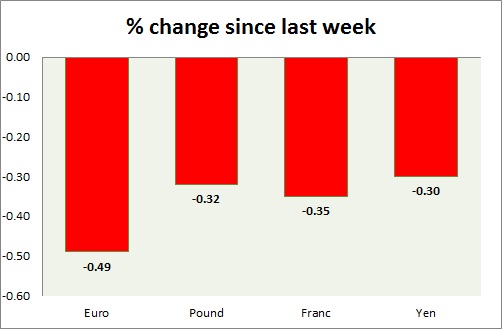 Strength meter (since last week) – Euro -0.49%, Franc -0.35%, Yen -0.30%, GBP -0.32%