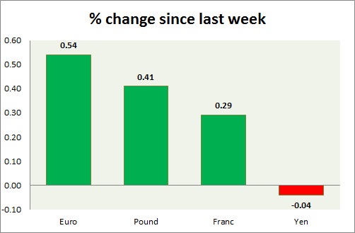 Strength meter (since last week) – Euro +0.54%, Franc +0.29%, Yen -0.04%, GBP +0.41%