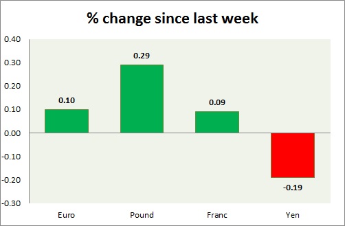 Strength meter (since last week) – Euro +0.10%, Franc +0.09%, Yen -0.19%, GBP +0.29%