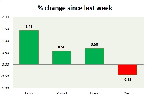 Strength meter (since last week) – Euro +1.43%, Franc +0.68%, Yen -0.45%, GBP +0.56%