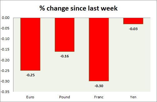 Strength meter (since last week) – Euro -0.25%, Franc -0.30%, Yen -0.03%, GBP -0.16%