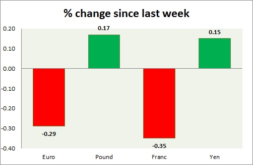 Strength meter (since last week) – Euro -0.29%, Franc -0.35%, Yen +0.15%, GBP +0.17%