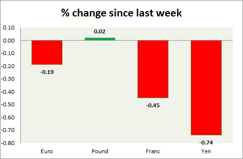 Strength meter (since last week) – Euro -0.19%, Franc -0.45%, Yen -0.74%, GBP +0.02%