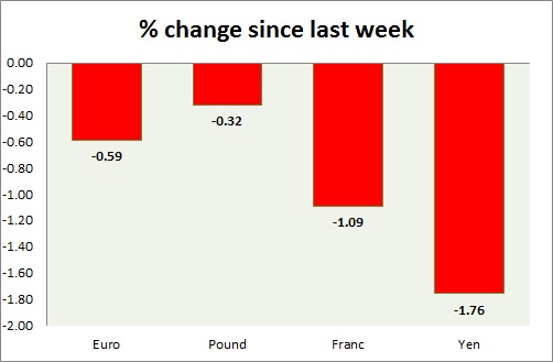 Strength meter (since last week) – Euro -0.59%, Franc -1.09%, Yen -1.76%, GBP -0.32%