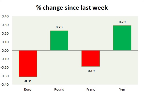 Strength meter (since last week) – Euro -0.31%, Franc -0.19%, Yen +0.29%, GBP +0.23%