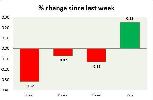 Strength meter (since last week) – Euro -0.32%, Franc -0.13%, Yen +0.25%, GBP -0.07%