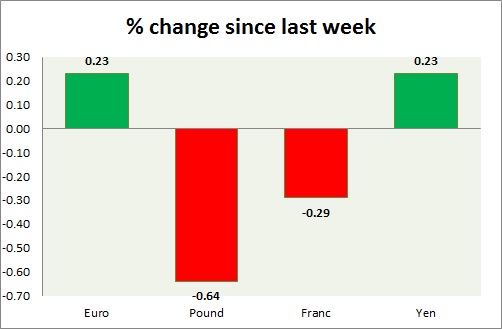 Strength meter (since last week) – Euro +0.23%, Franc -0.29%, Yen +0.23%, GBP -0.64%